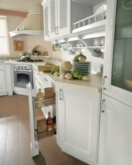 Le ante della cucina Taormina sono realizzate esclusivamente in legno e in diverse finiture: dal classico noce, passando dal decapè avorio al bianco laccato fino ad arrivare alla originalissima finitura in verde acqua, venato di bianco.