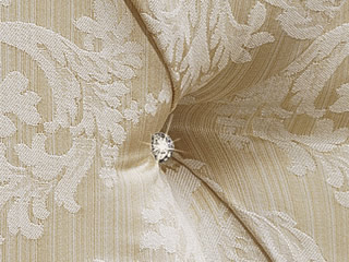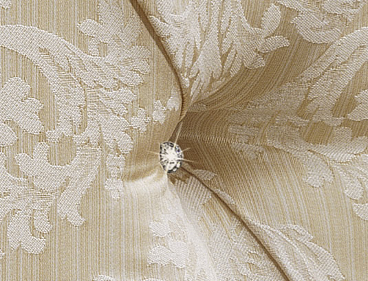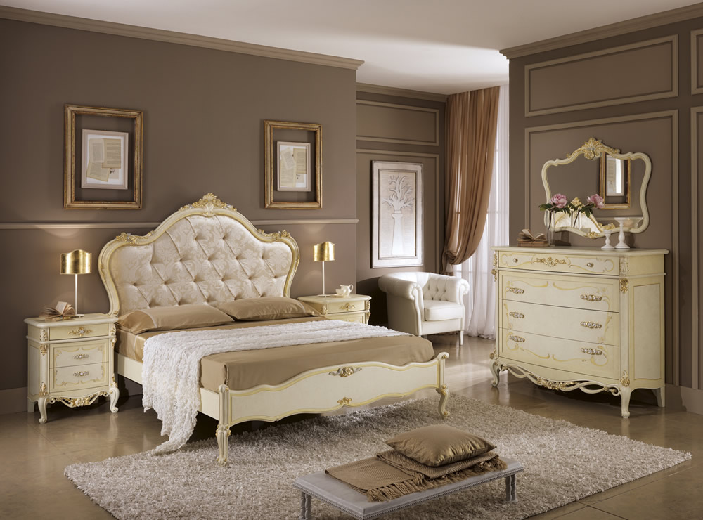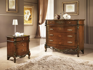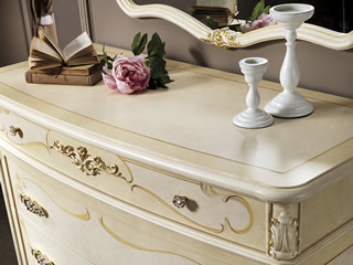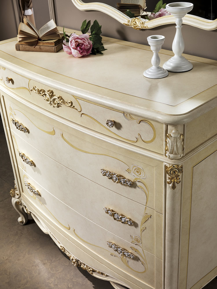 The triptych of dresser and bed tables (realized in patina sponged and brown finishes) presents the same sinuous lines of the wardrobe and the same golden handles and the same decorum of the bed (and true Swarovski optionals).